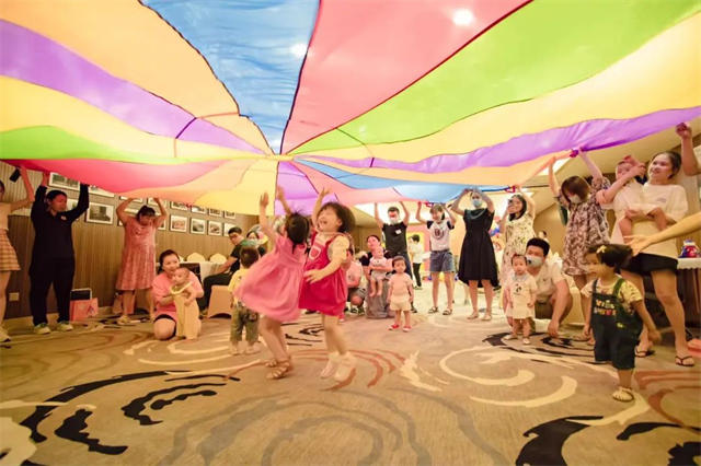 降落伞活动开始前,主持人号召爸爸妈妈小朋友们一起动手参与铺降落伞,大家非常积极而且团结协作,把降落伞升起落下。在爸爸妈妈的陪伴下,小朋友们随着音乐节奏摇起手摇铃、追赶七彩泡泡,脸上满是欢笑!